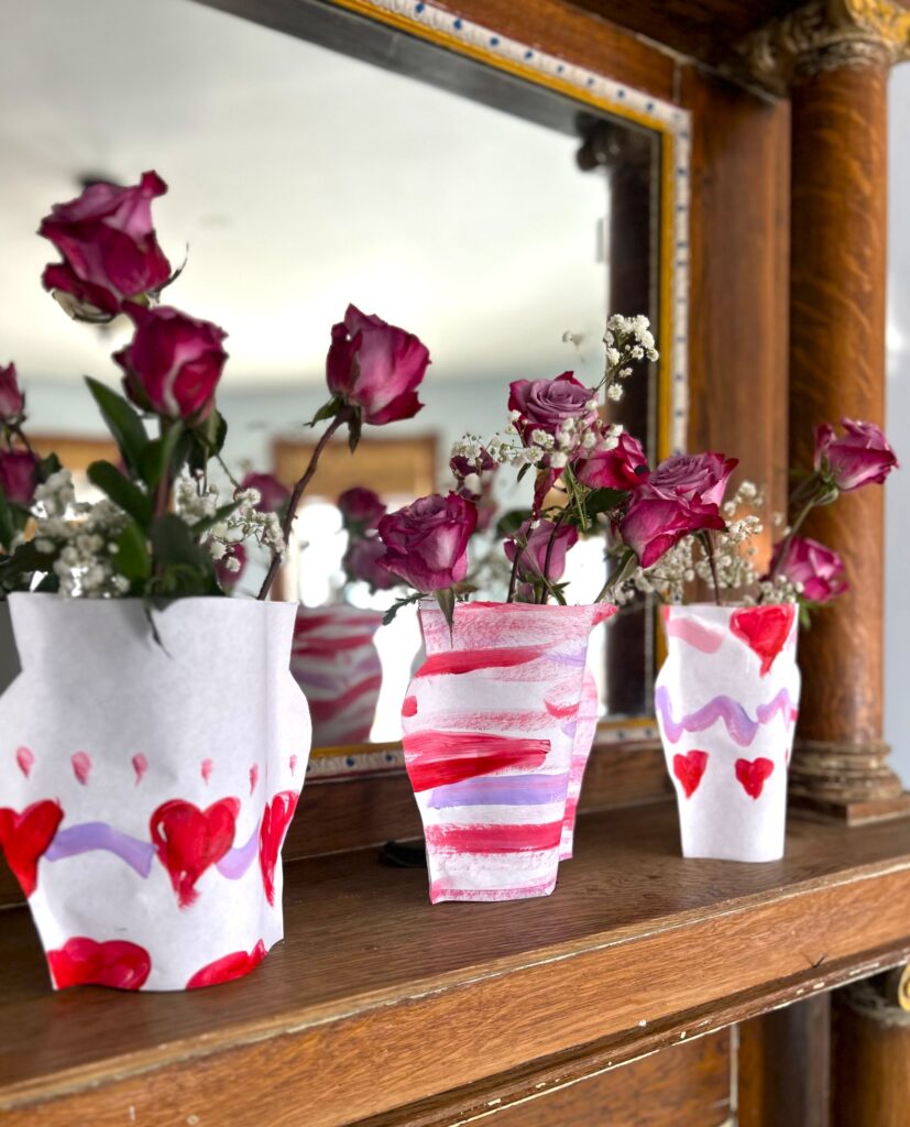 Flowers and Valentine’s Day go hand-in-hand, so lean into hearts and warm hues. On white craft paper, paint loose stripes of red, pink, and purple, or add hearts and dots in a playful pattern. This step is especially fun for kids—just be sure to let the paint dry completely. The personal, handmade touch is always a hit.