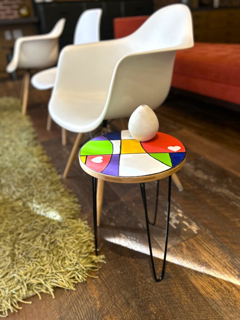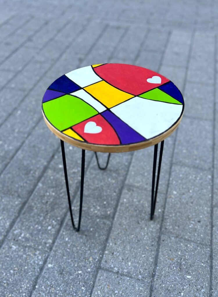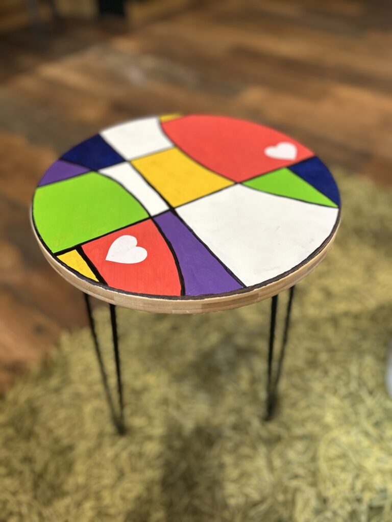 You’re sure to feel the love when you give a small accent table a colorful new look. Your heart might even beat a little faster when you see how happy this little piece looks dressed up in bold colors and a heart or two.