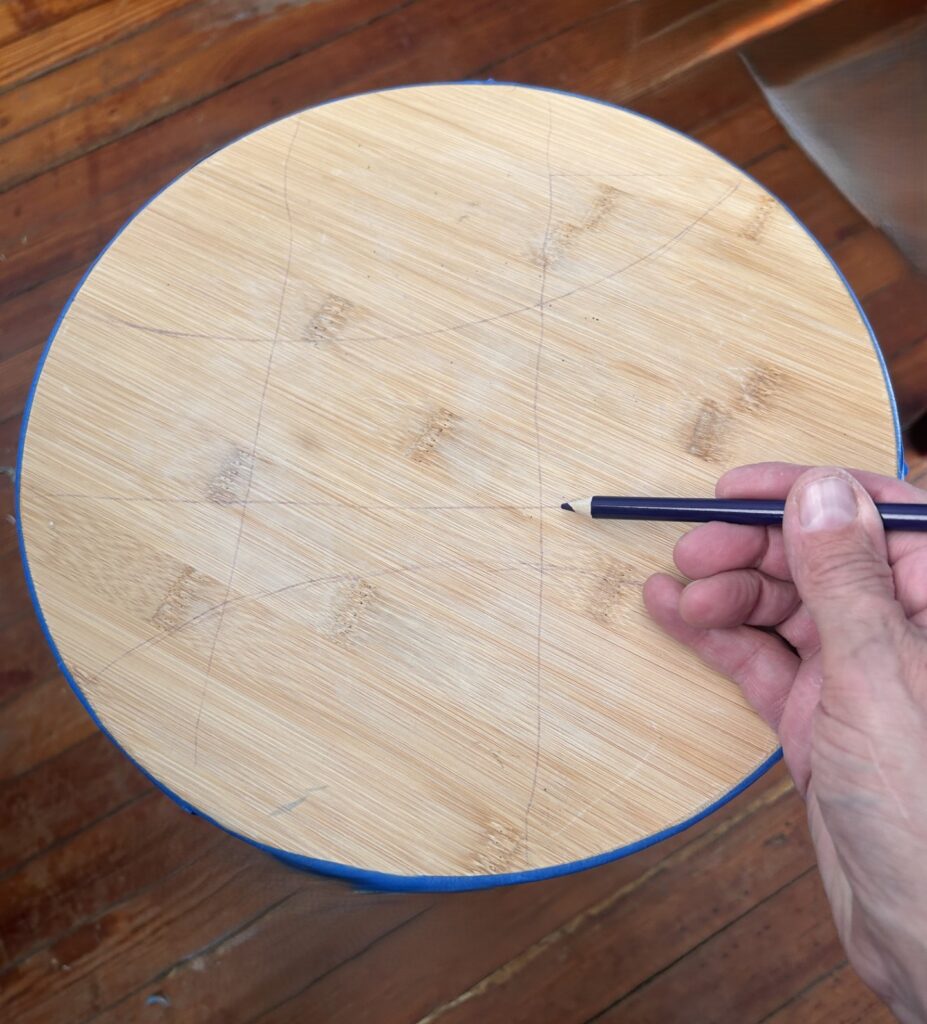 To give your tiny table a big, bold upcycle, start by using a pencil to map out your design. To play up the round top, I drew circular shapes that flowed off the edges. I did this freehand, but you could also use a small plate to trace.