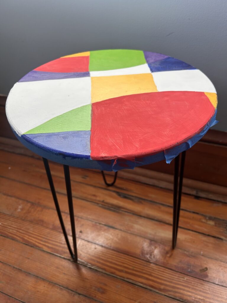 Select bright colors from your paint collection. Use painter’s tape to protect the side edge of the tabletop. Paint one section here and another there using the same color, then repeat with different colors until the entire surface is covered.