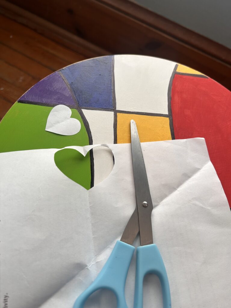 Cut two small hearts from white paper and secure them with school glue, craft glue, or good old Elmer’s. I placed mine on the red sections in a way that no matter which way the table is turned, it always looks happy.