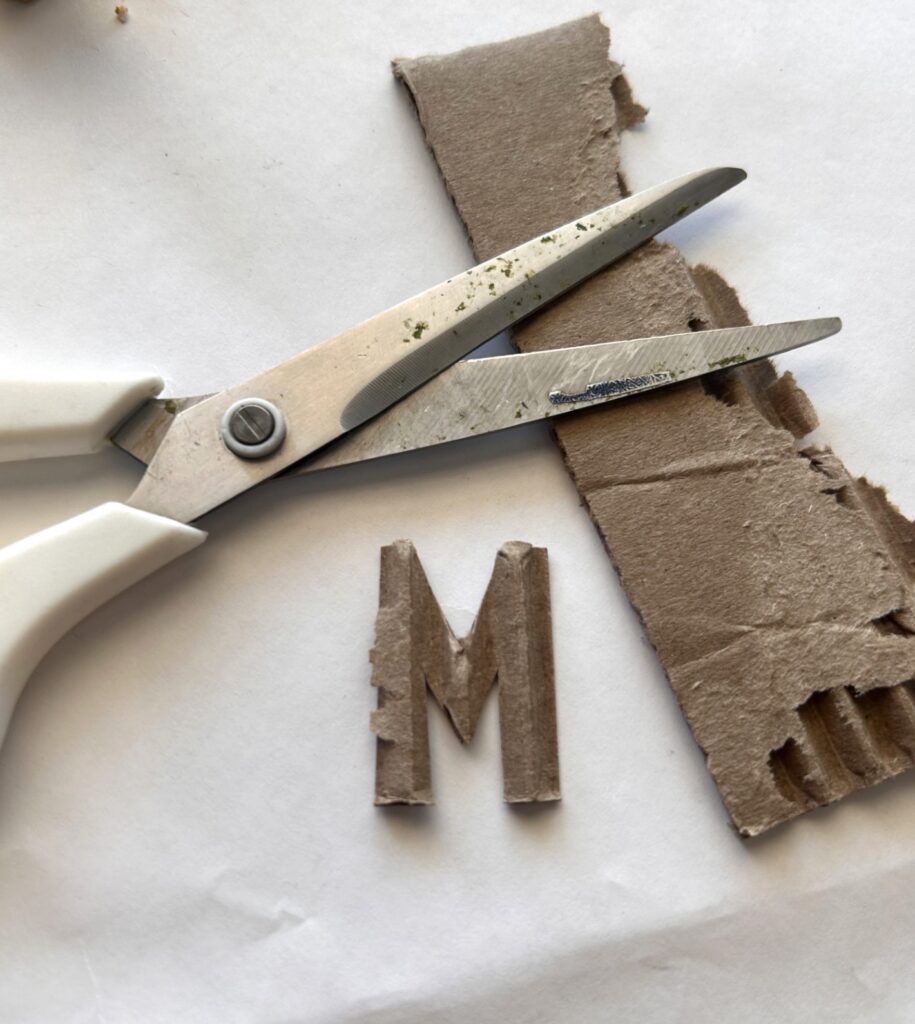 Every castle bears a crest. Personalize your piece by cutting an initial from cardboard and attaching it to the front of the tower. Corrugated cardboard was used to give it a little more visual weight and texture. I added an “M” for Milo—now officially marking this as his royal domain.