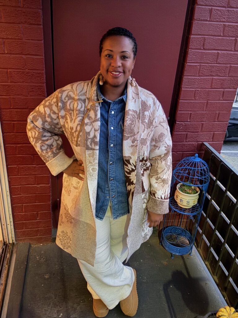 Last week, I wore a warm and cozy outfit to the office, where the items were thrifted from local Greater Washington stores. I began with the sweater, which was new with tags from Anthropologie. The style was similar to a buttonless cardigan with pockets. I matched them with cream knit pants purchased from Goodwill. The pants are from Marled, which is also sold at Anthropologie. I layered the look with a denim shirt and platform boots to be extra comfortable throughout the day.