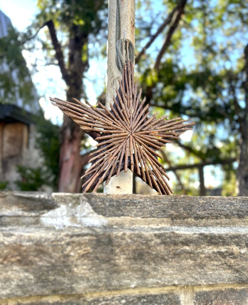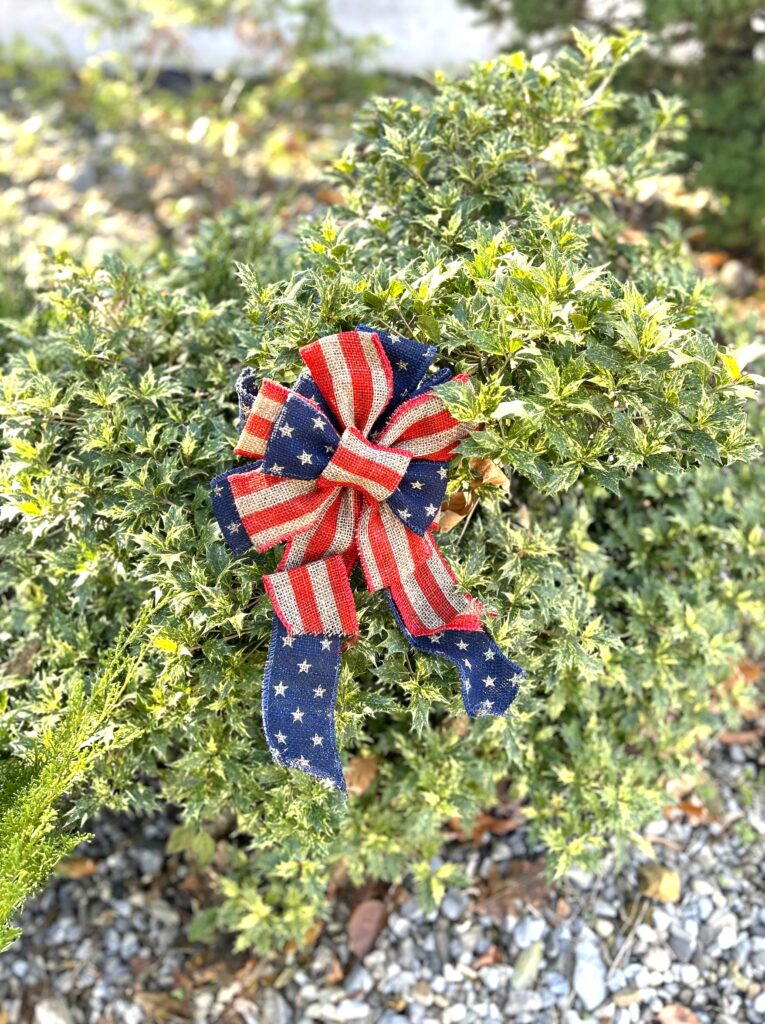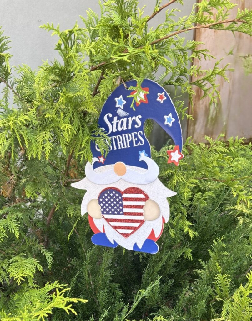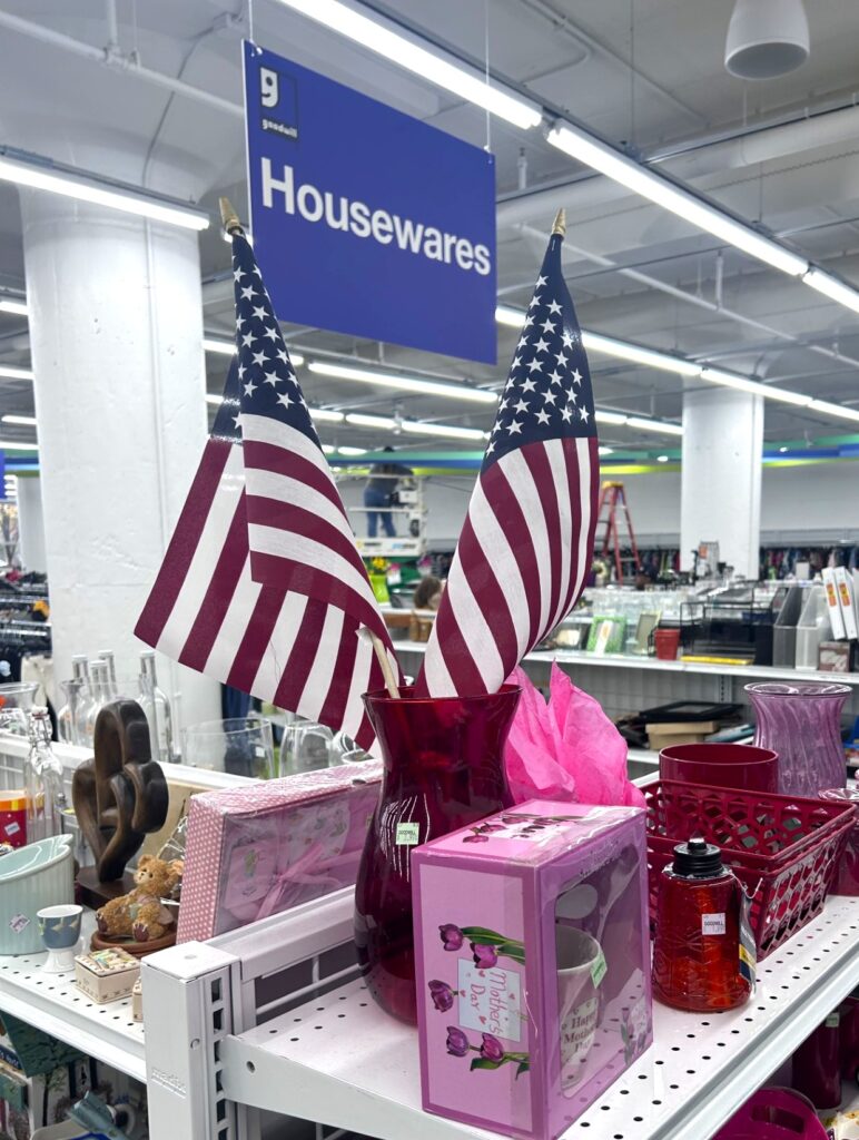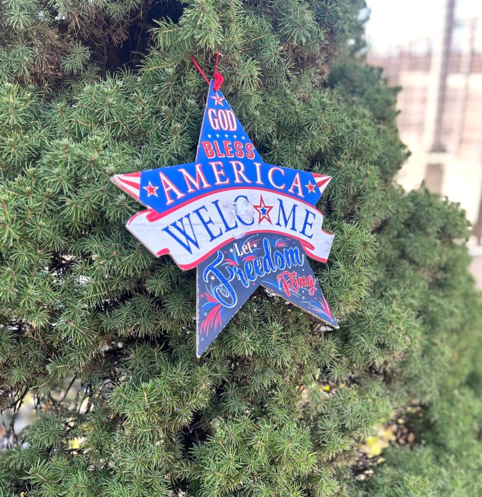 I headed to my local Goodwill nonprofit retail store on New York Avenue, my go-to spot for all things creative for lower-than-low prices. I found several perfect items: small American flags, a wooden star-shaped art piece, and a few red, white, and blue accents. Each piece added just the right amount of sparkle and spirit — like a “thank you” note written in color and light — without overwhelming the sacred space.