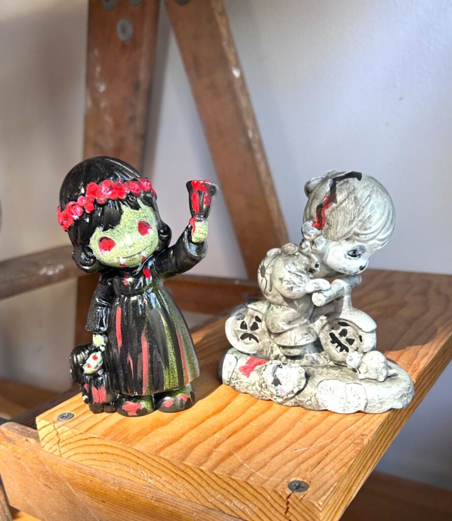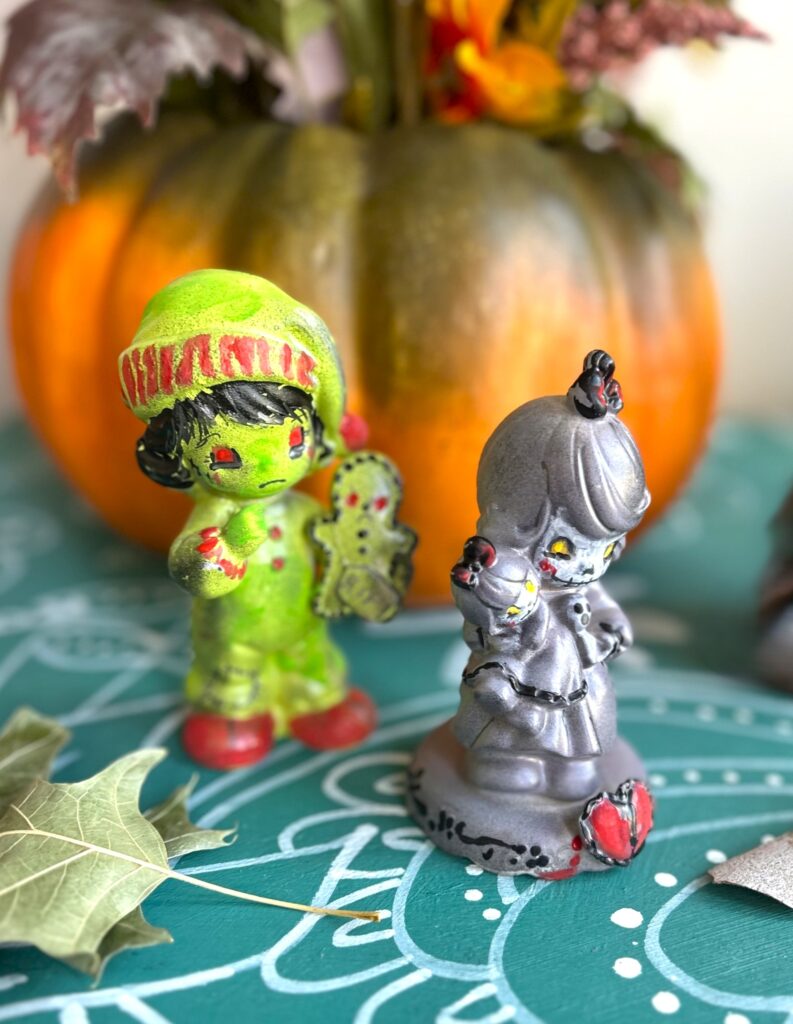 With a little paint and a lot of playfulness, these cherubs of cheer became creatures of fear. It’s the perfect creepy upcycle—part thrift, part thrill, and all treat!
