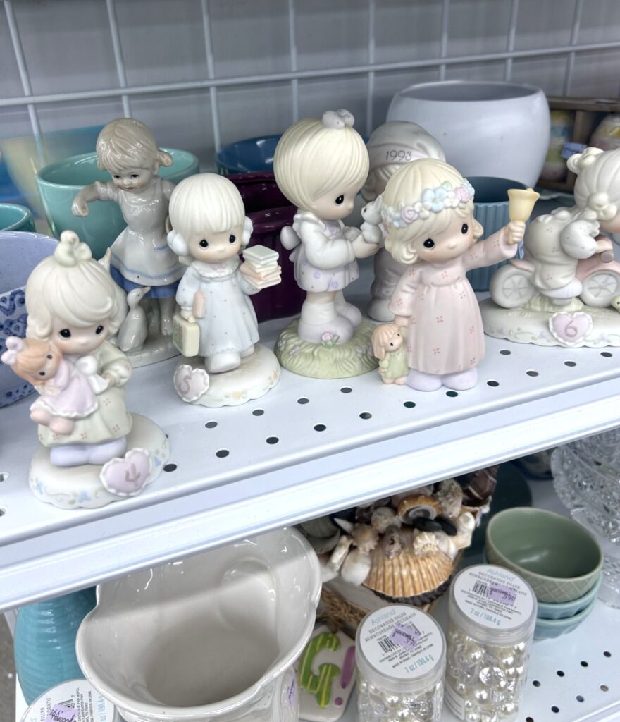 Who says Halloween décor has to be frightfully expensive? At Goodwill, you can dig up some boo-tiful bargains just waiting for a second life. This season, I unearthed a shelf of sweet-faced “Precious Moments” figurines—normally angelic and innocent, but oh, the ghoul-portunities!