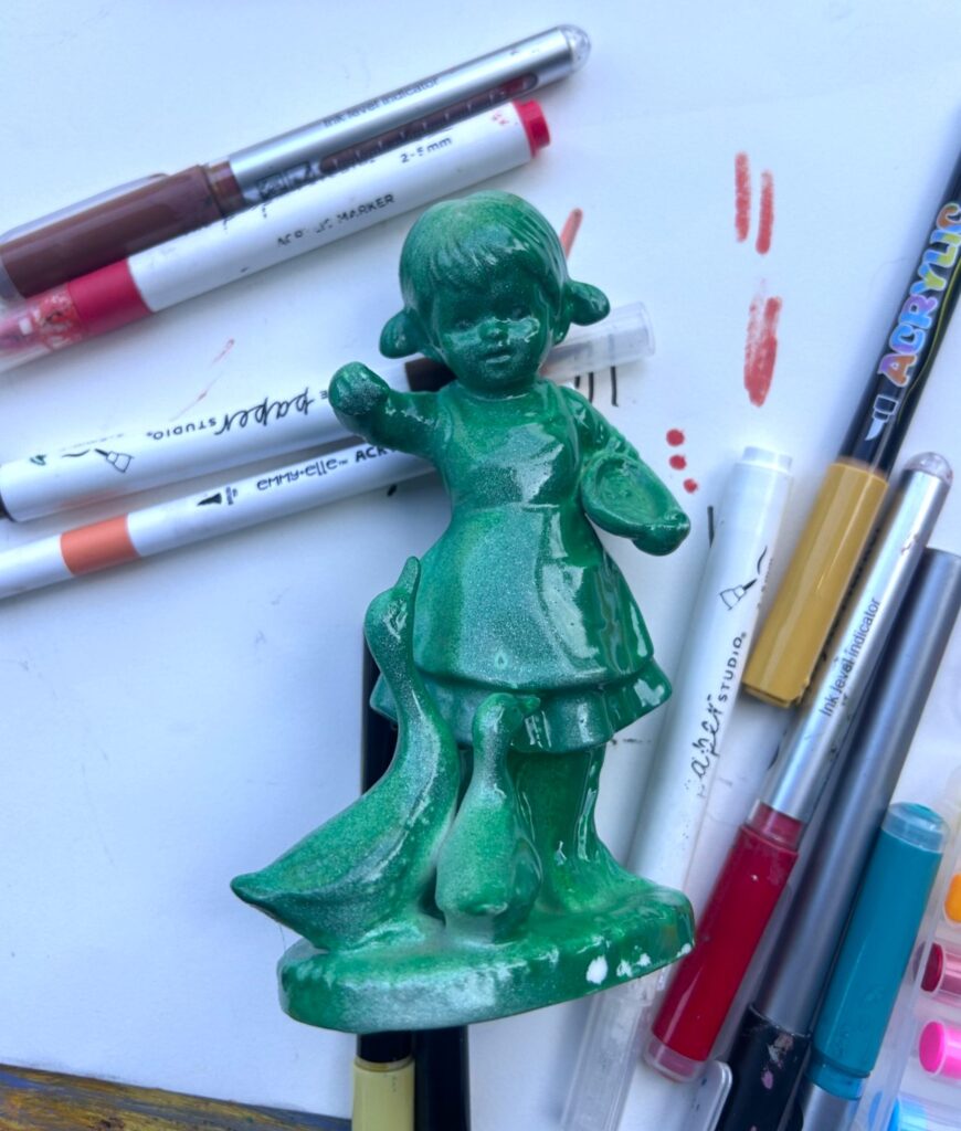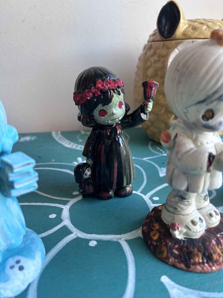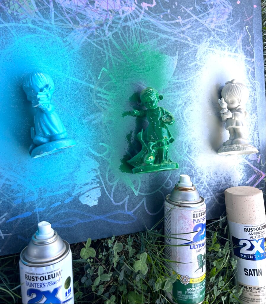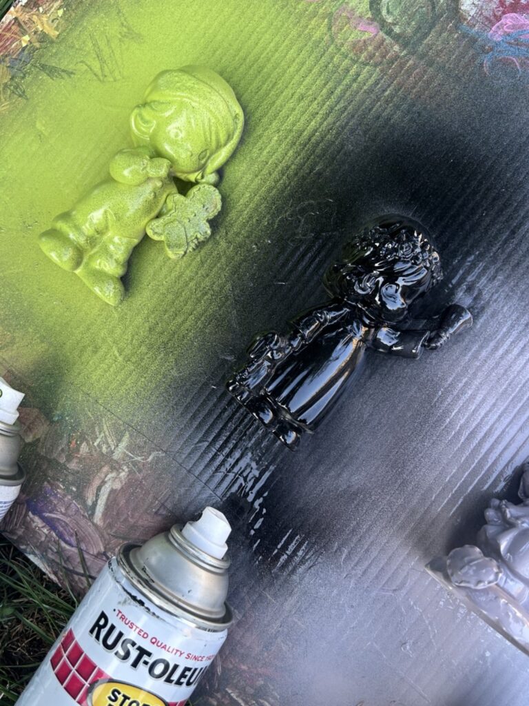 Honestly, I couldn’t decide what color to select as the base coat, so I tried them all! A precious Halloween-related DIY featured figures painted black and I wanted to expand my horizons, so to speak. And several times the paint from one figurine blew onto the one next to it. This added a lovely layer to add more visual delight…sometimes a mistake is the best part!