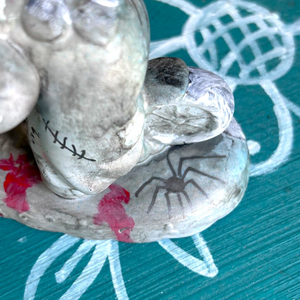 Paint pens are your trick and your treat. Draw stitches, dripping fangs, hollow eyes, or cobwebs with spiders to give each figure its own haunted story.