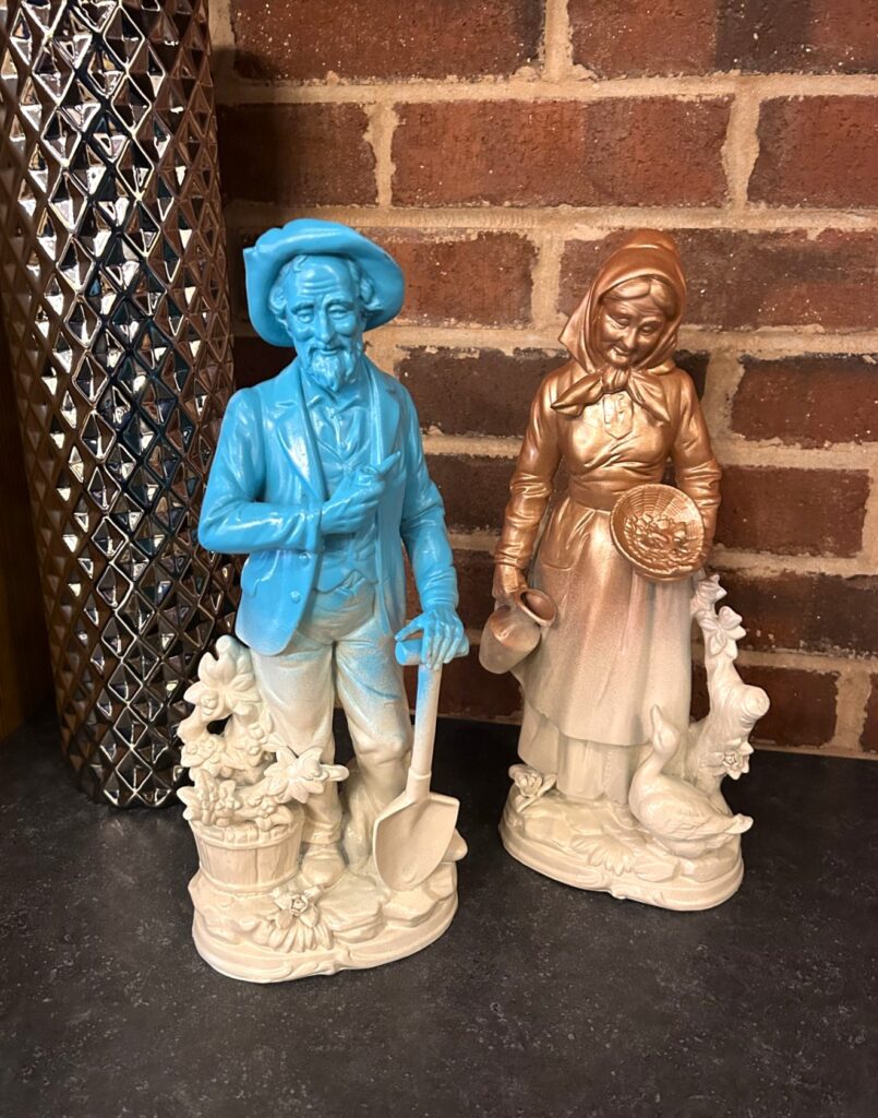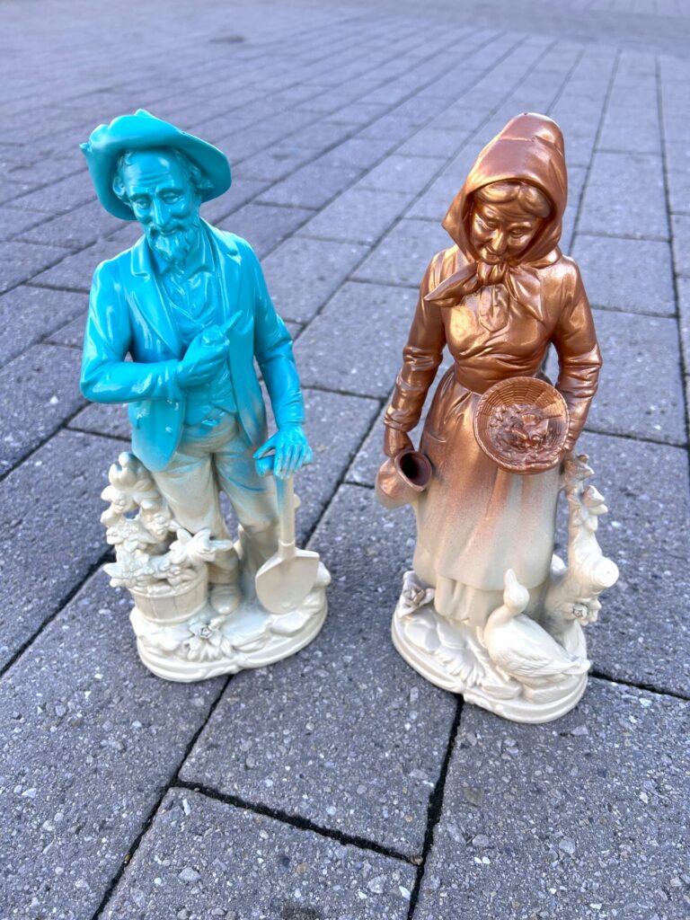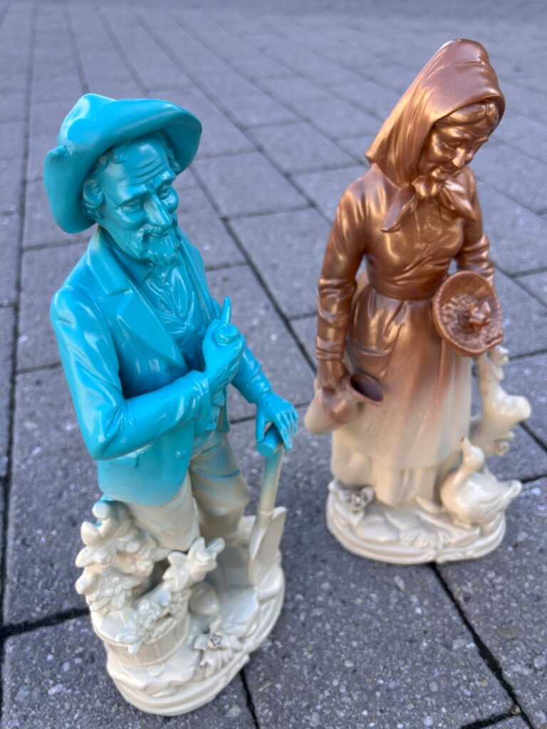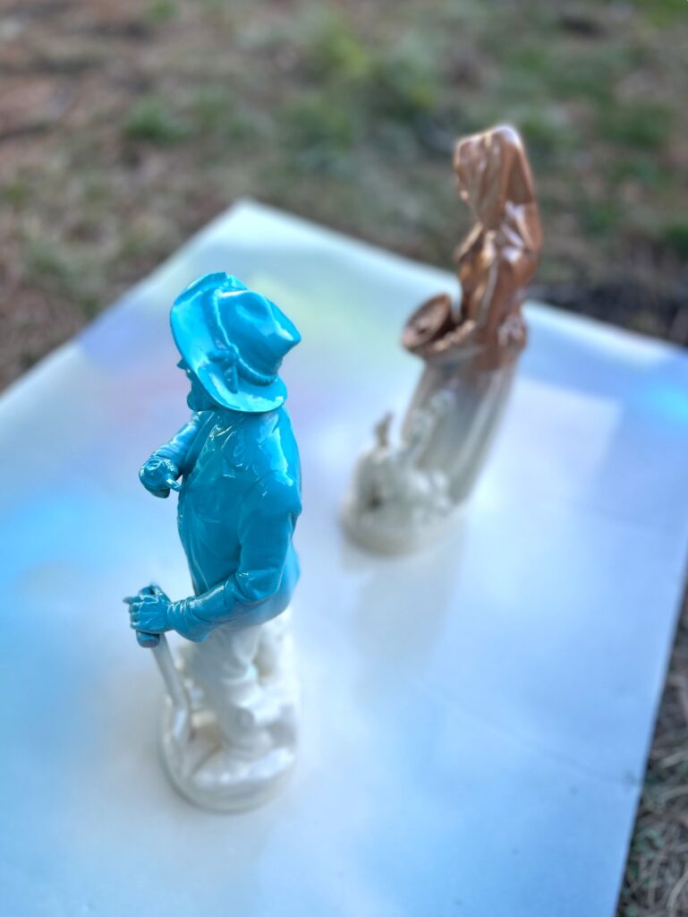 First, I sprayed the bottoms of each statue with a warm neutral color, beige. Then I tried blue on the man’s upper half and copper on the woman’s.