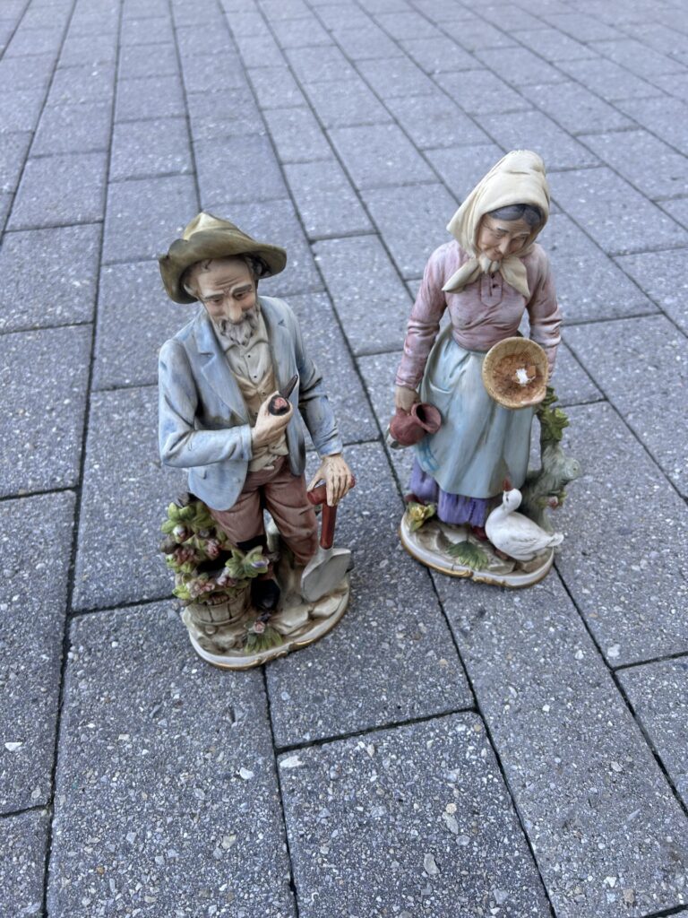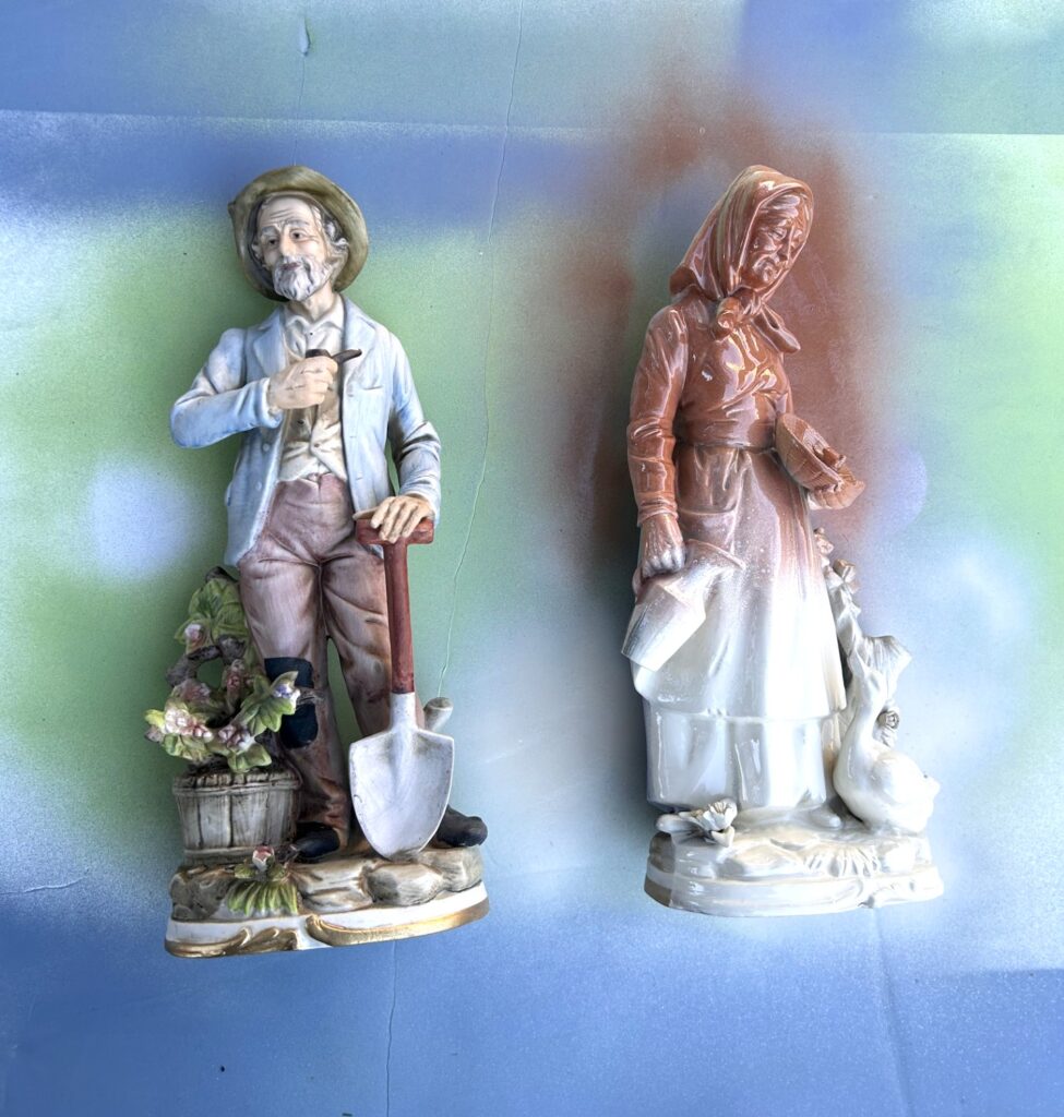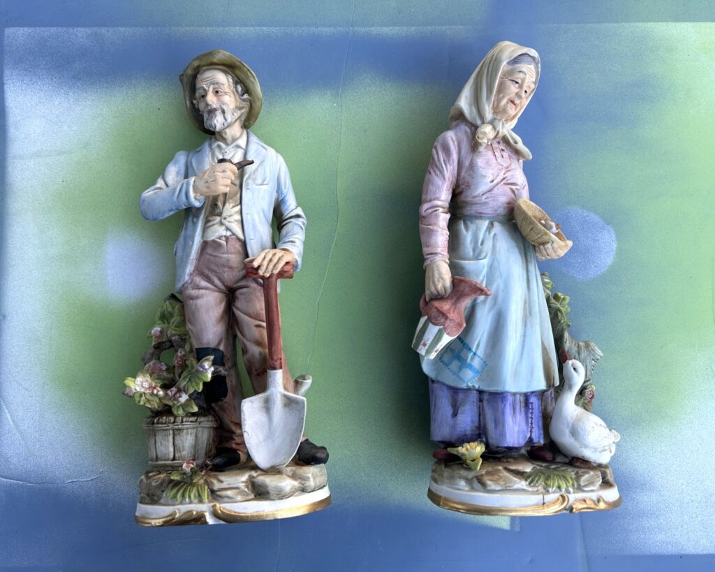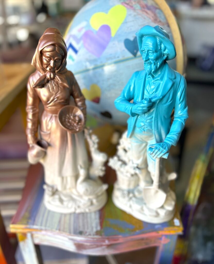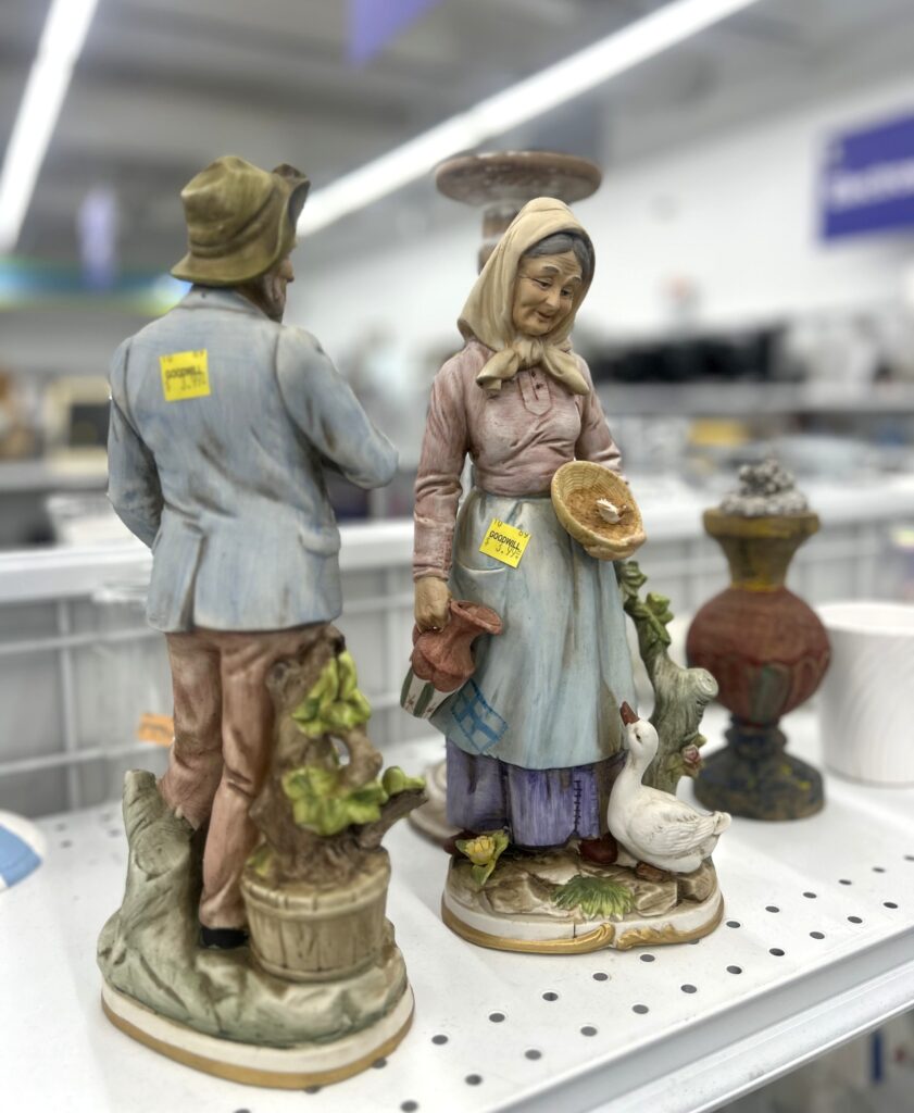 Later, back home in DC, I spotted this distinguished couple in the homewares section at Goodwill’s New York Avenue NE store. Their detailed clothing, expressive faces, and quirky accessories—a garden shovel and a hungry duck—caught my eye. This seasoned pair clearly deserved a new chapter, so into my cart they went.