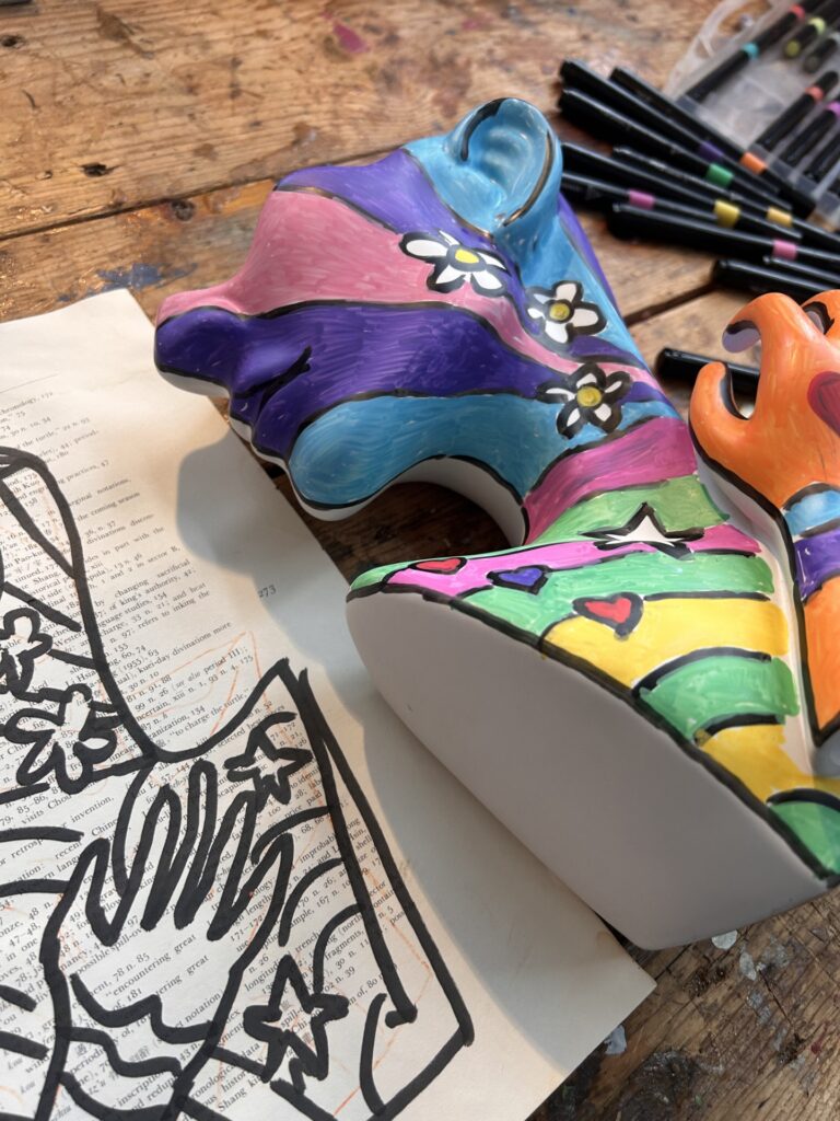 My latest set (a total steal at $15!) had every color imaginable. I began with a black paint pen to outline the design, creating sections for color just like in Max’s work. Then came the fun part: filling in those spaces with bold primaries and electric hues.